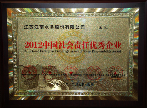 12月7日,2012中國(guó)企業(yè)社會(huì)責(zé)任年會(huì)在北京召開(kāi),在會(huì)上發(fā)布的“2012(第四屆)中國(guó)企業(yè)社會(huì)責(zé)任榜”中,公司憑借在履行社會(huì)責(zé)任方面的優(yōu)秀表現(xiàn),獲得了“社會(huì)責(zé)任優(yōu)秀企業(yè)”的榮譽(yù)稱(chēng)號(hào)。責(zé)任指數(shù)評(píng)估得分為78.66分,在上榜的80個(gè)企業(yè)中排名第41,是唯一獲得此獎(jiǎng)項(xiàng)的水務(wù)企業(yè)。