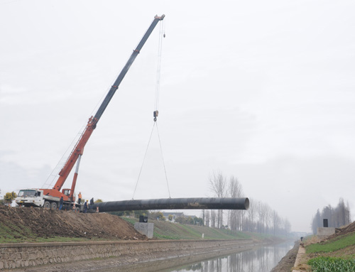 窯港河DN1400過河管是整個(gè)管道施工中的重點(diǎn)和難點(diǎn),管道跨度近30米,鋼管整體重量達(dá)11噸,且安裝地點(diǎn)兩岸地質(zhì)松軟,給吊裝工作增加了難度。對(duì)此,市政公司不等不靠,積極作為,多次組織專業(yè)技術(shù)人員和業(yè)務(wù)能手深入現(xiàn)場(chǎng),對(duì)周圍環(huán)境進(jìn)行勘察,研究并制定了一套詳細(xì)的吊裝專業(yè)操作方案,為安全保質(zhì)完成吊裝任務(wù)提供了可靠保證。施工當(dāng)天,在場(chǎng)工作人員各司其職,配合默契,隨著現(xiàn)場(chǎng)總指揮的一聲令下,大型吊車緩緩伸出巨大的手臂,通過精準(zhǔn)指揮、精細(xì)操作,最終管道一次性準(zhǔn)確地吊至預(yù)定位置。