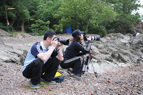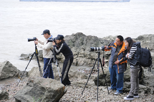 6月2日,攝影小組部分成員一早來到鵝鼻嘴公園,拍攝水流。在長江邊大家或蹬或站或架起三腳架,拍攝不同水流的狀態(tài),即慢速拍攝,一般情況下的平原河流,采用三腳架,速度在1/4秒以下進行拍攝,圖片的水流具有如紗如霧的夢幻效果。在天氣晴好的陽光下拍攝水流,如果使用更慢的速度,需要鏡頭前加裝一個DN濾光鏡;如果沒有ND鏡,可用偏振鏡替代?焖倥臄z,速度在1/500秒以上進行拍攝,拍出的效果使得水流狀態(tài)逼真再現(xiàn),或波浪滔天或水花四濺,畫面瑰麗多姿。