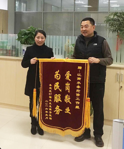 “等等,我還不知道你們的名字呢。”第2天一大早,袁女士便帶著錦旗,送來了她對搶修隊(duì)員的感謝。